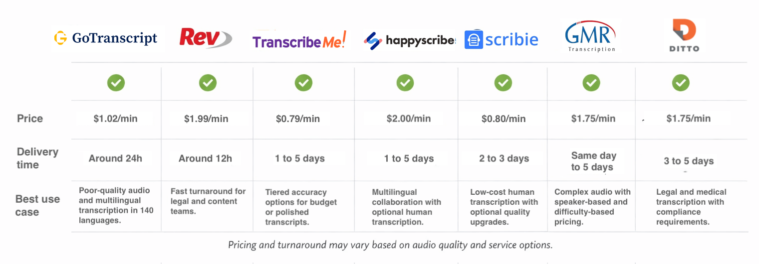 (GoTranscript, GMR Transcription, Ditto Transcripts, Rev, TranscribeMe, HappyScribe, Scribie)