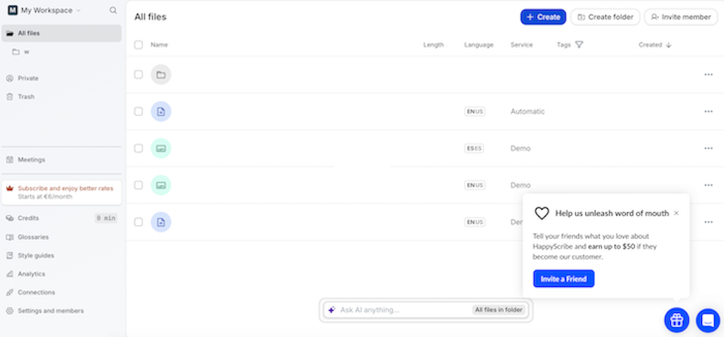 HappyScribe positions itself as a full transcription and subtitling platform rather than a pure service provider. Human transcription and proofreading are available as premium options, often alongside AI-generated drafts.